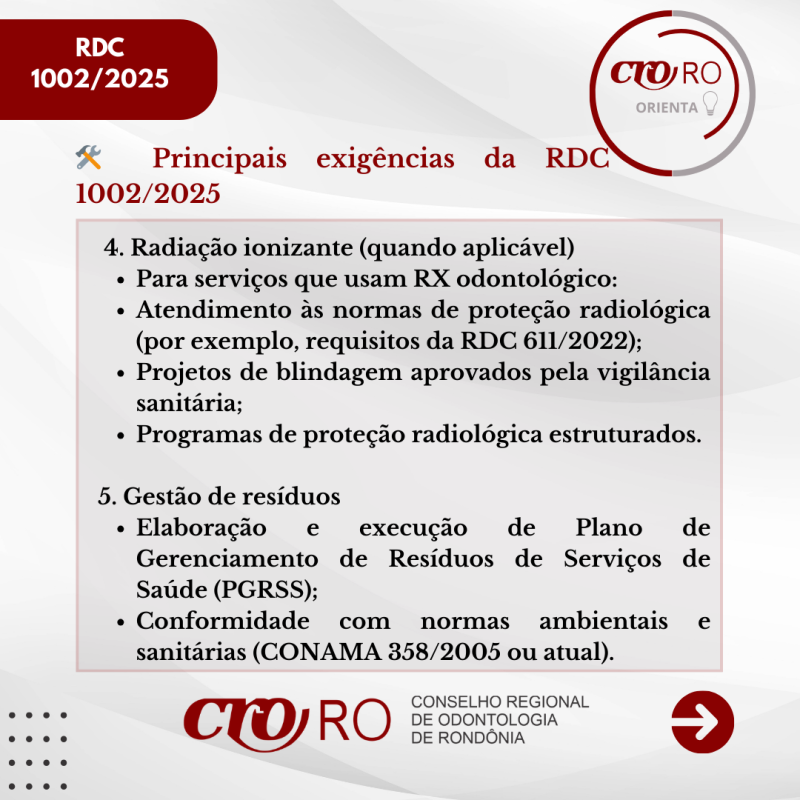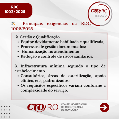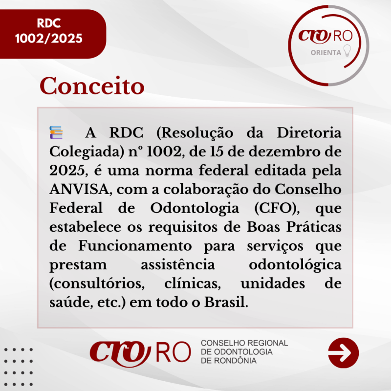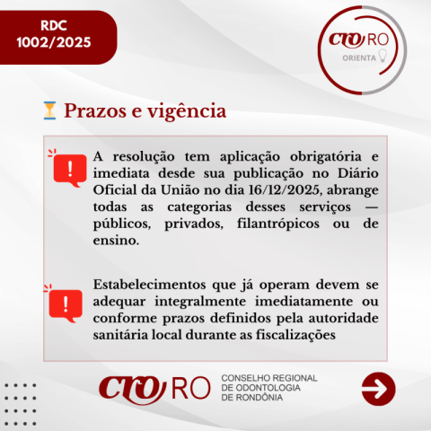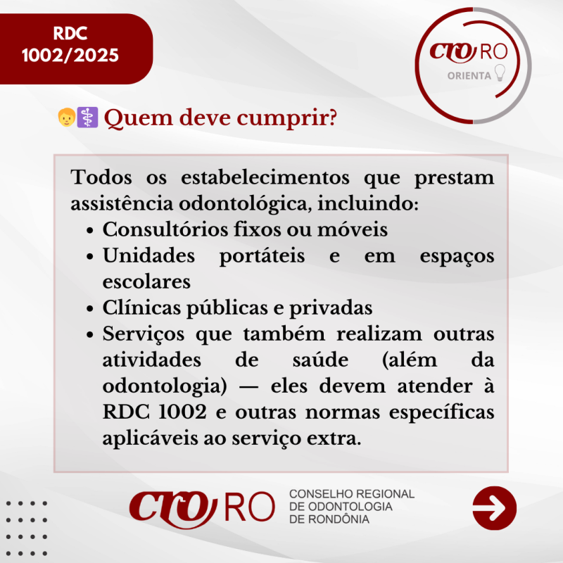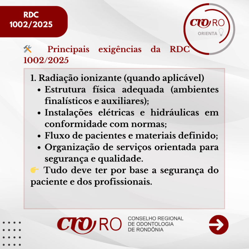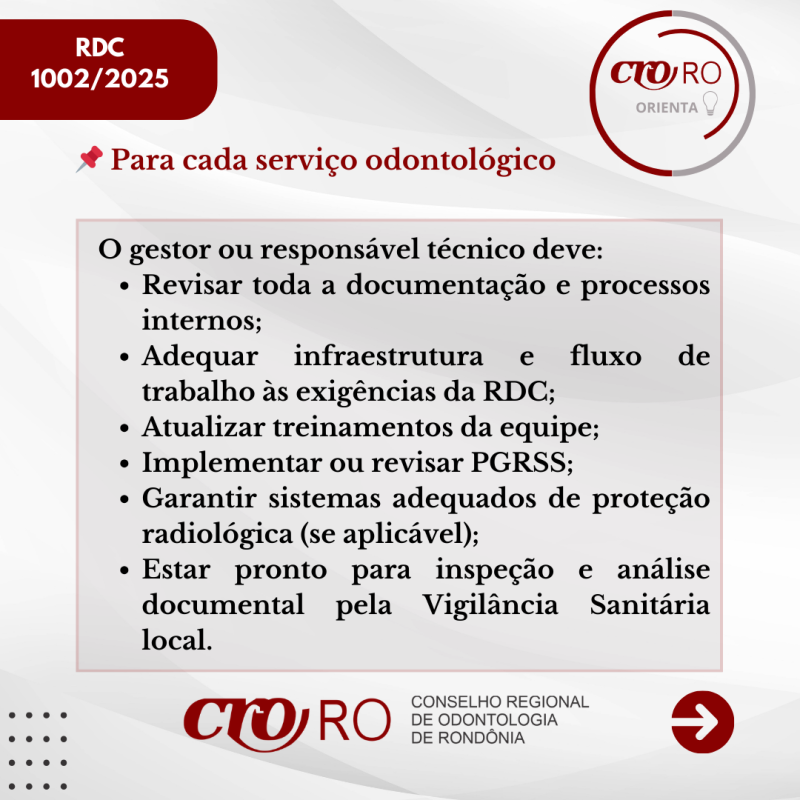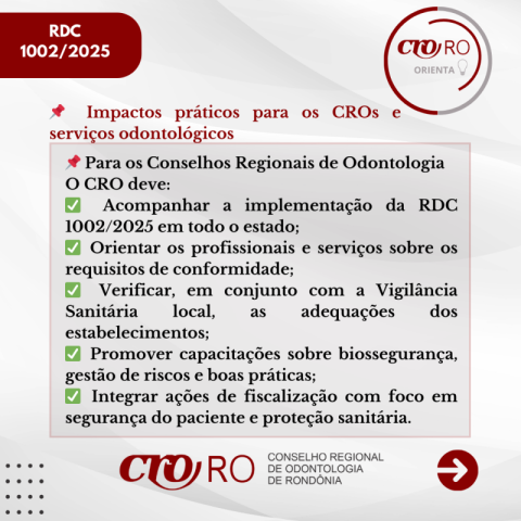 O CRO-RO orienta os profissionais e responsáveis técnicos a conhecerem o conteúdo da resolução e verificarem se seus serviços estão em conformidade com as novas diretrizes, contribuindo para a melhoria da qualidade da assistência e para a segurança dos pacientes.