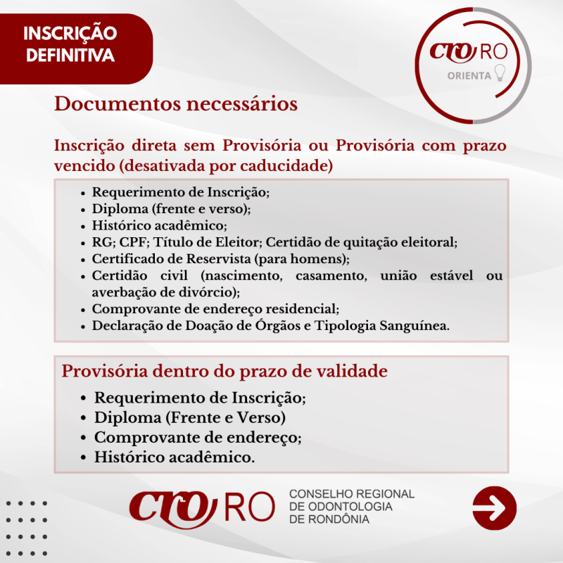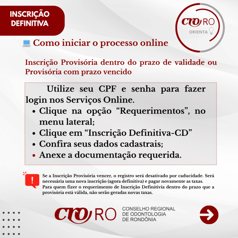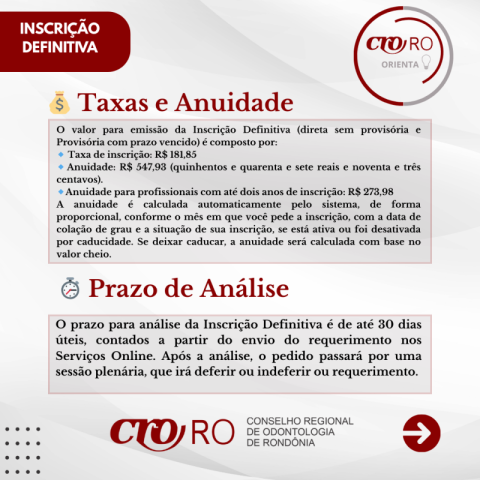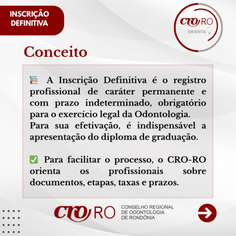 A Inscrição Definitiva é o registro profissional permanente e por prazo indeterminado, obrigatório para o exercício legal da Odontologia.