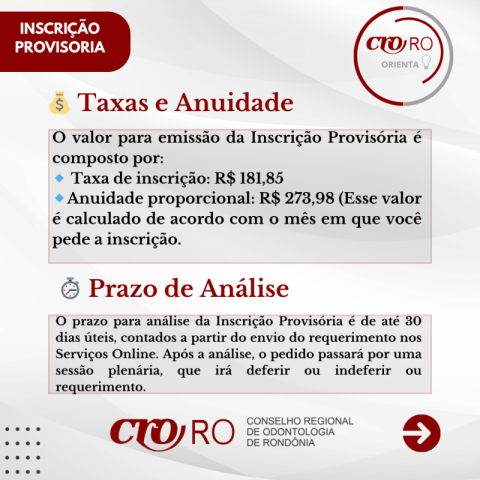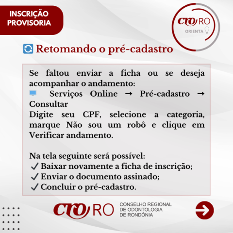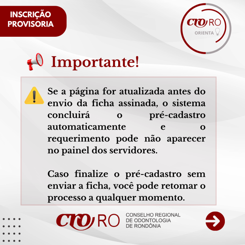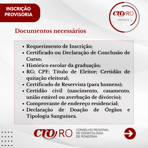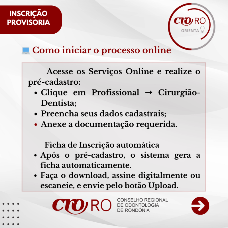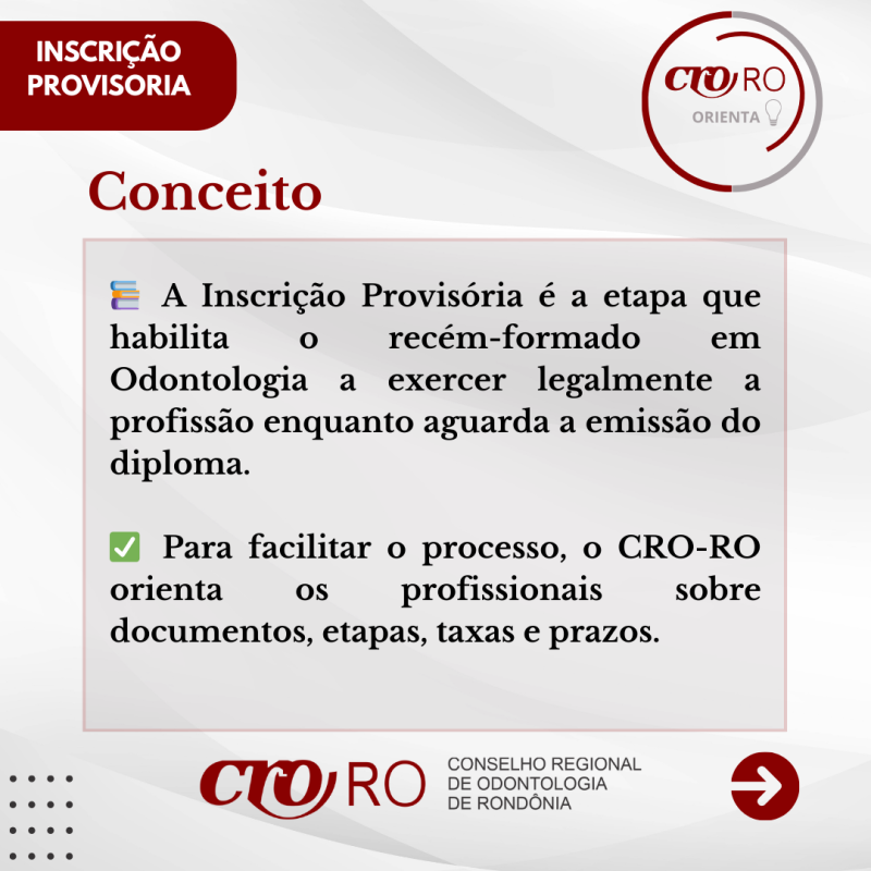 O CRO-RO informa aos recém-formados em Odontologia que a Inscrição Provisória é o registro que permite o início do exercício profissional enquanto o diploma definitivo ainda não foi emitido pela instituição de ensino. O processo é realizado de forma totalmente online, por meio dos Serviços Online do Conselho.