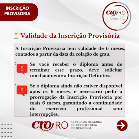 A Inscrição Provisória possui validade de 6 meses contados a partir da data da colação de grau. O Conselho reforça que: