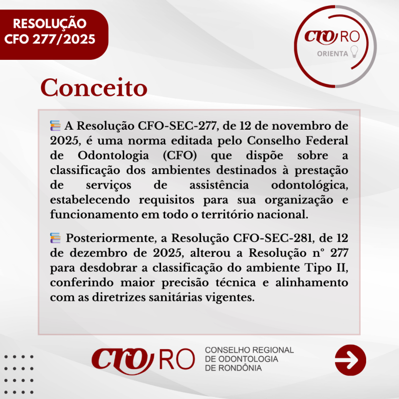 O Conselho Federal de Odontologia editou a Resolução CFO-SEC nº 277, de 12 de novembro de 2025, que dispõe sobre a classificação dos ambientes destinados à prestação de serviços de assistência odontológica em todo o território nacional.