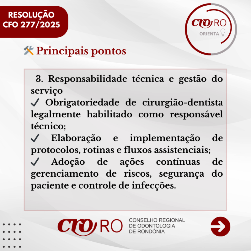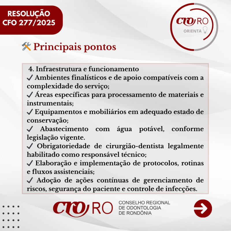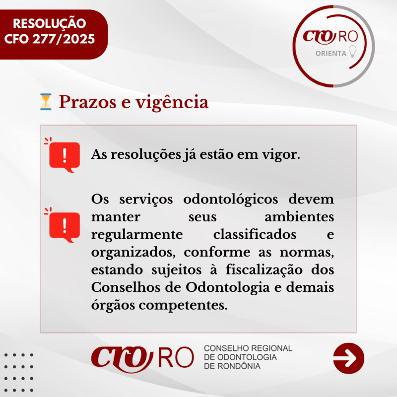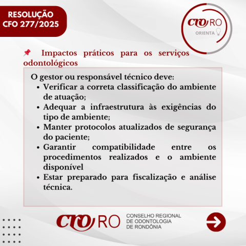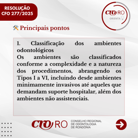 O CRO-RO orienta os profissionais a consultarem o conteúdo das resoluções e verificarem se os ambientes utilizados para a prestação de serviços odontológicos estão corretamente classificados, de acordo com a legislação vigente.