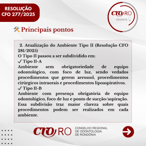 Posteriormente, foi publicada a Resolução CFO-SEC nº 281, de 12 de dezembro de 2025, que promoveu alteração na Resolução nº 277. A atualização desdobrou a classificação do ambiente Tipo II, conferindo maior precisão técnica à norma e aprimorando a adequação dos ambientes odontológicos às diretrizes sanitárias.