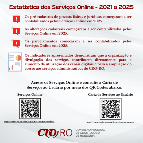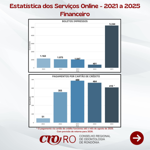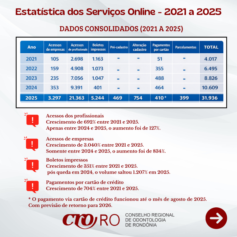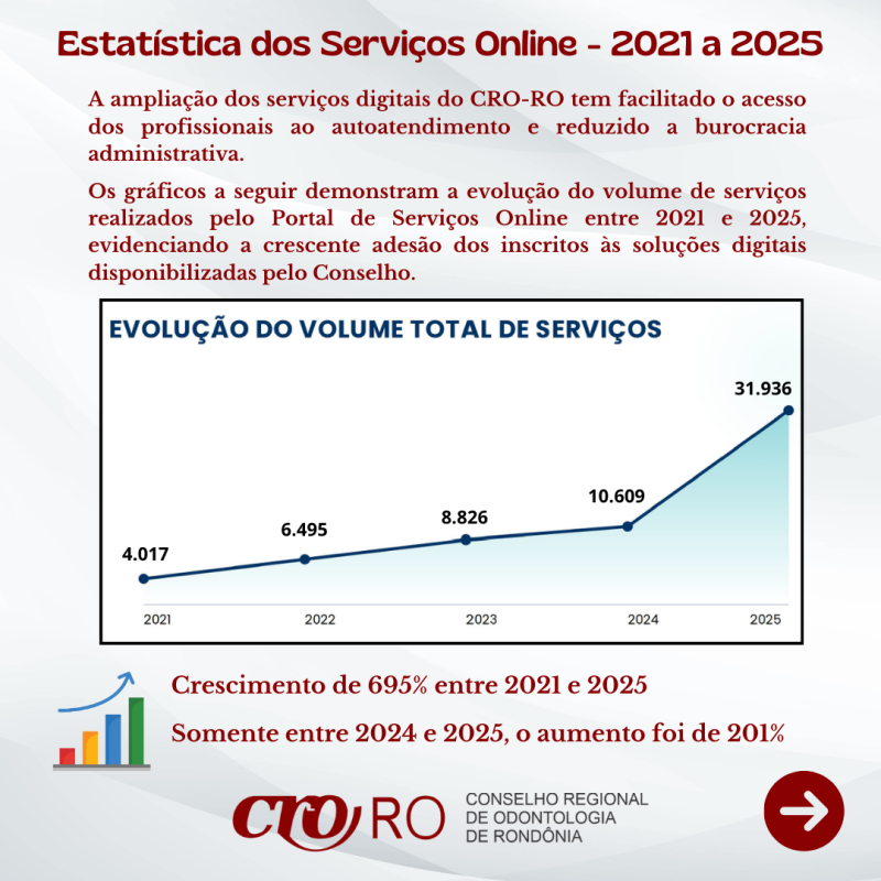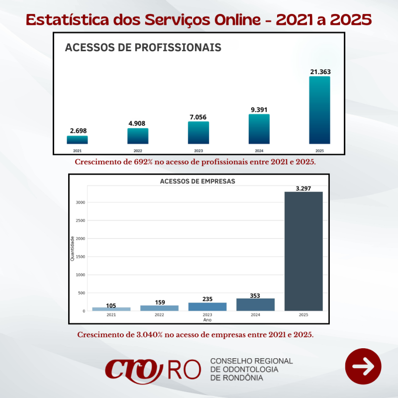 O avanço observado nos últimos anos reforça o papel do portal digital como um importante canal de atendimento e relacionamento entre o CRO-RO e os profissionais e empresas registrados no Conselho.