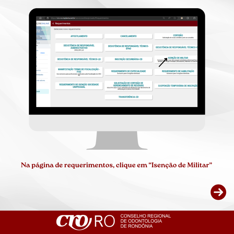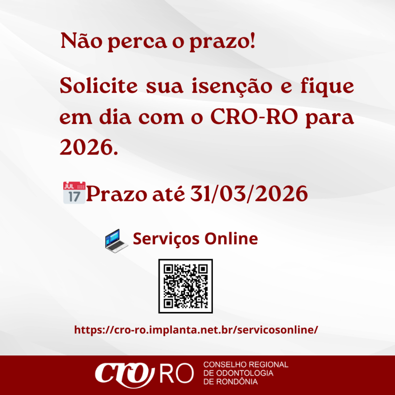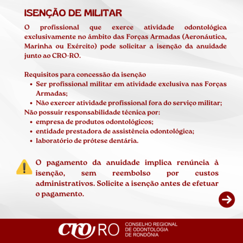 Profissionais inscritos no CRO-RO que exercem atividade odontológica exclusivamente no âmbito das Forças Armadas podem solicitar a isenção da anuidade, desde que atendam aos requisitos estabelecidos.